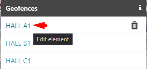 7. Finally, you can edit the geofence by clicking on it's name or delete geofences by clicking on the trashcan icon next to it's name: