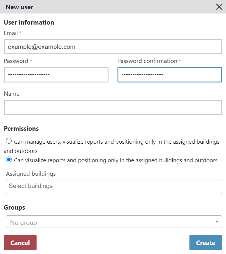 It would also be mandatory to assign a building to the user, which should be selected from the drop-down menu that will appear after clicking on Select Buildings. It is possible to assign 1 to N buildings to users and they will only have permissions over assigned buildings.