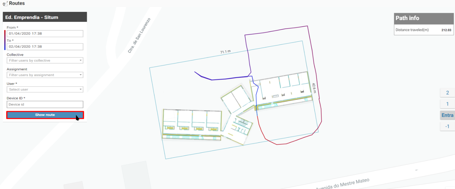Once the Show Route button is clicked, the route that the selected user or device made will be drawn upon the floorplan, where Red will represent the starting point and Blue the ending point.