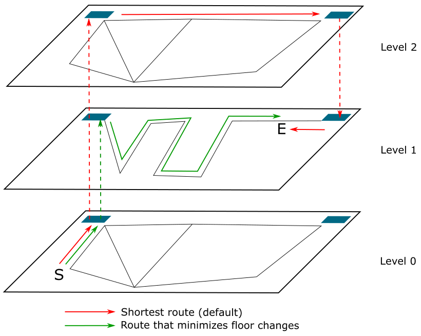 Consider the following example. The user is at point S (Start) and wants to go to point E (End). Due to the atipical morphology of the Level 1, the shortest route requires the user to move up to Level 2, traverse it, and go back down to Level 1. This is clearly unnatural and probably a waste of time. A more natural way would be to go up from Level 0 directly to Level 1, even if this implies walking a longer distance.